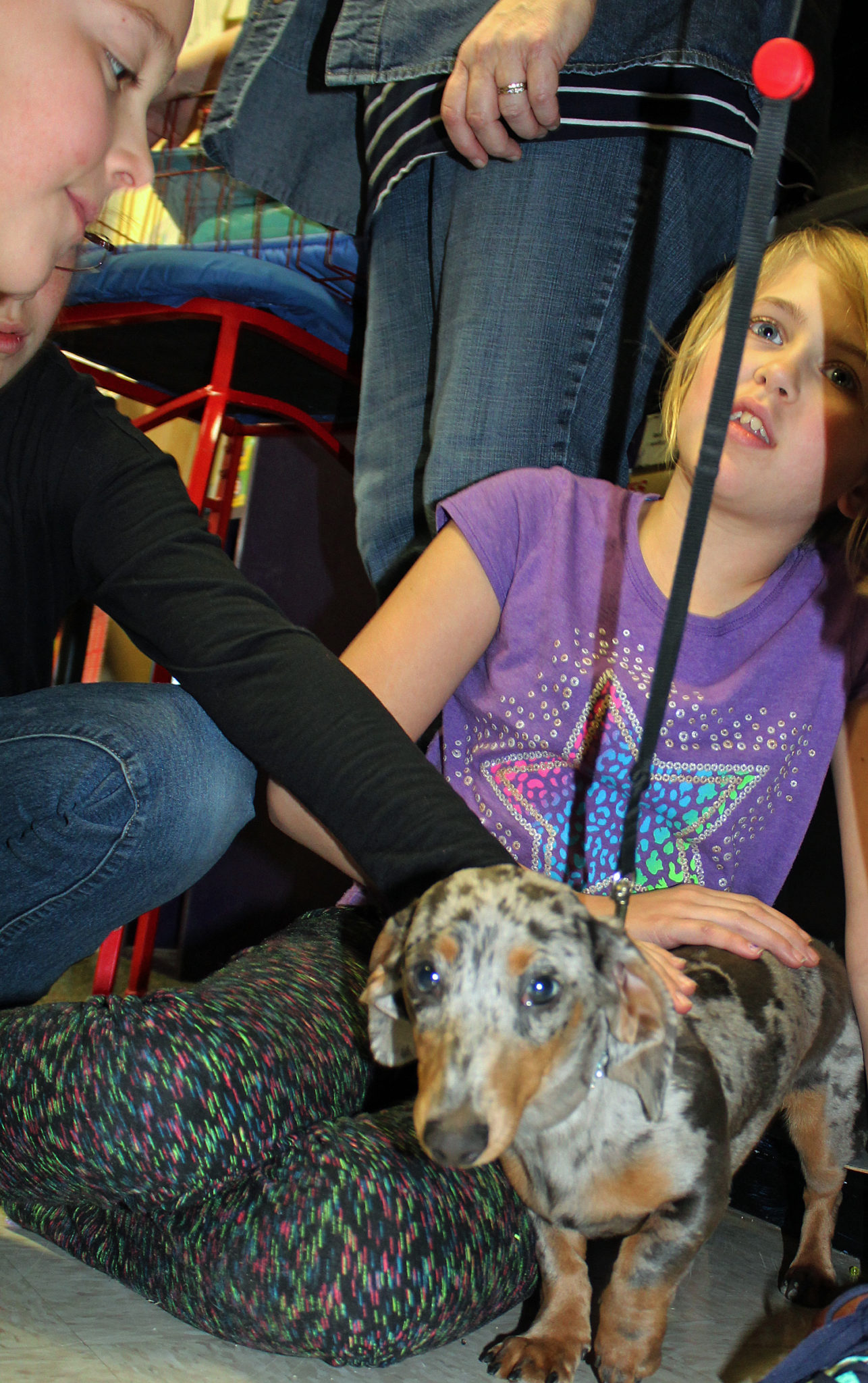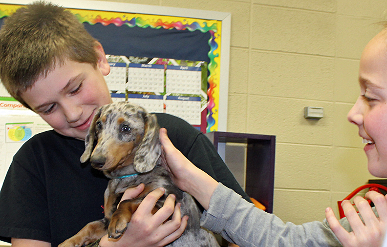So, at the end of the school day on Friday, Luke brought Cookie to Jade's class, and the students took turns holding and petting the dog.