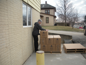 Mitchell Rawson, a parishioner from Sacred Heart in Walker, getting boxes full of packaged meals ready to ship.