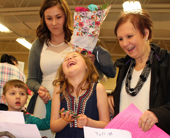 "It's a TURTLE, Grandma!" Kaydyn Hendryx shows her art to mom Rachelle Rammelsberg and grandma Leona Dulin after the Tilford 1st grade concert.