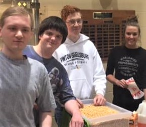 Ethan Davis (second from left) and Alex Maynard (right) stop for a moment during a Vinton Popcorn work day to pose for a photo with classmates.