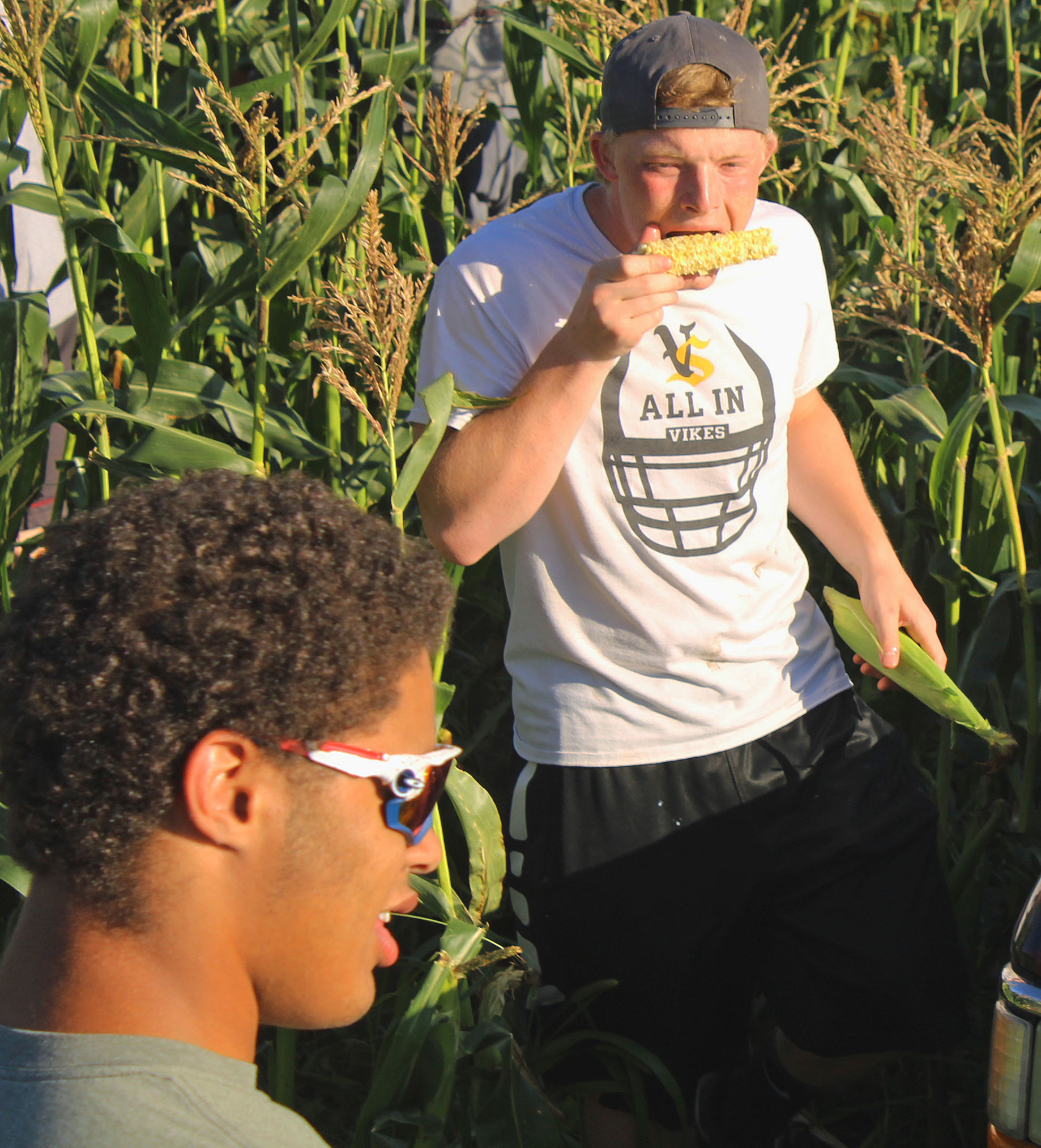 Tanner Cummings was among a few VS players to try sweet corn, fresh from the field, before cooking.