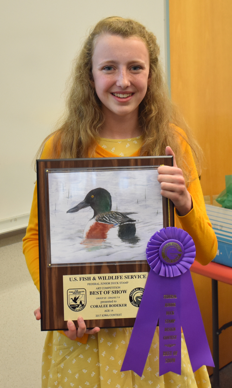Coralee Bodeker of Vinton, also a volunteer for the Buchanan County Conservation Board, won the Best in Show for the state of Iowa in the Federal Junior Duck Stamp Art Competition in grades 7-9.