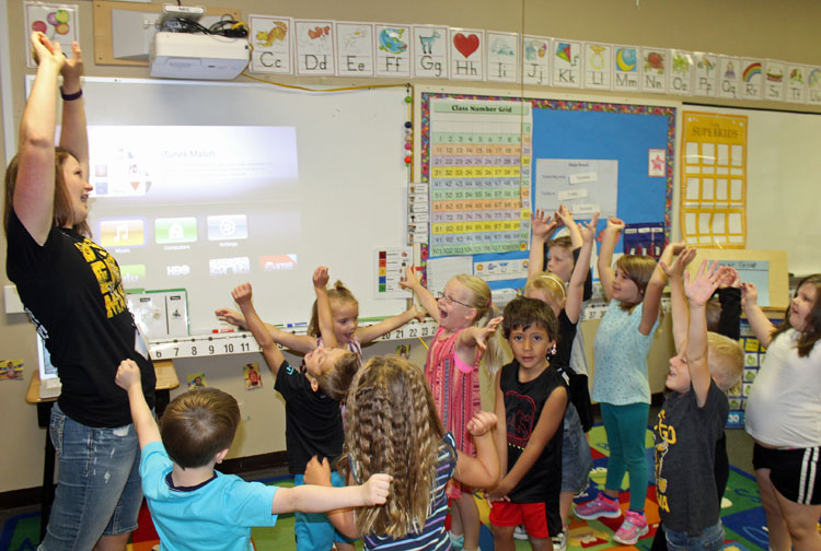 Friday was Day 1 for Shellsburg Elementary Kindergarten students, as well as for their teacher, Emily Hanson. Mrs. Hanson is pictured leading her children in a song to help them get the wiggles out so they can sit still for their first reading lesson.
