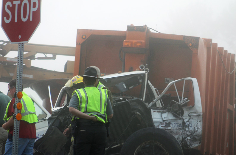 Heavy fog affected visibility; the garbage truck apparently turned left in front of the semi, which was hauling hay grinding equipment. Witnesses say three men in the garbage truck were taken by ambulance to a hospital, some with life-threatening injuries.