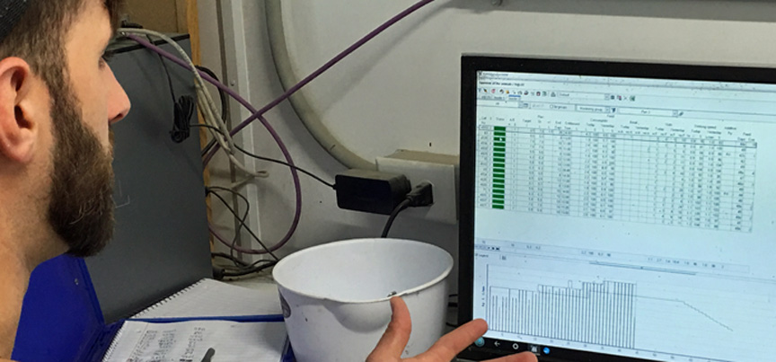 Mason Corkery uses a computer system to monitor the calf-feeding operation.