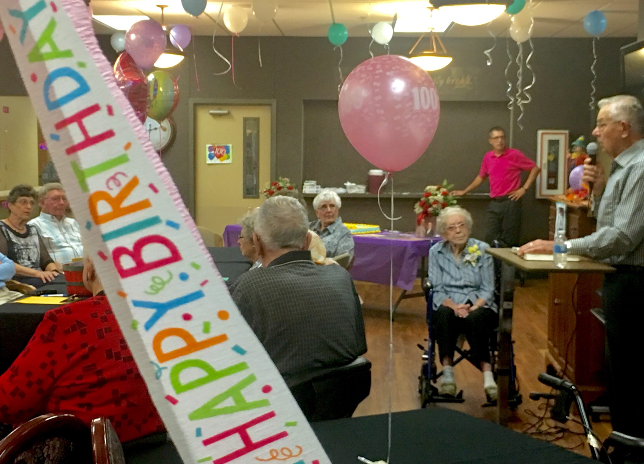 "Ask the employees at the Vinton Lutheran Home why they do the jobs that they do, and the majority would say that they greatly enjoy working with the residents," said Smith. Today, our staff was especially reminded of why they love their jobs as they celebrated a very special occasion. Florence Meyer turned 100 years old today and had an amazing party to commemorate the event. Staff, family, and friends gathered to wish her well. Guests enjoyed cake, punch, and musical entertainment. Florence later went outdoors and let 100 balloons float into the sky. What a special day for all."