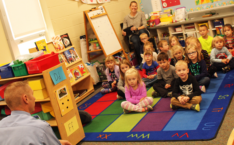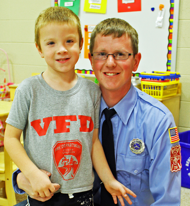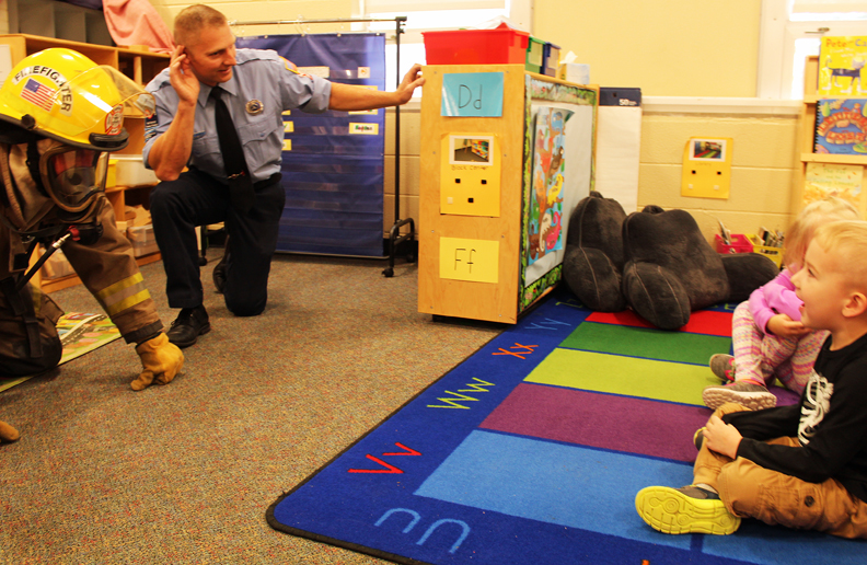 The first visit took place Tuesday morning, when a few Vinton firefighters visited Mrs. Lutz's preschool classroom at Tilford. The students learned about calling 911, how smoke and heat rises, so they should stay low as they escape, and having a family meeting place.