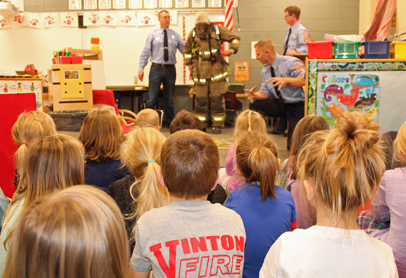 Firefighters planned visits to Kindergarten and 1st grade classes on Wednesday in Vinton. Second grade classes will visit the fire station on Tuesday. There they will see the variety of vehicles the VFD uses, as well as have an opportunity to take a turn operating a fire hose.