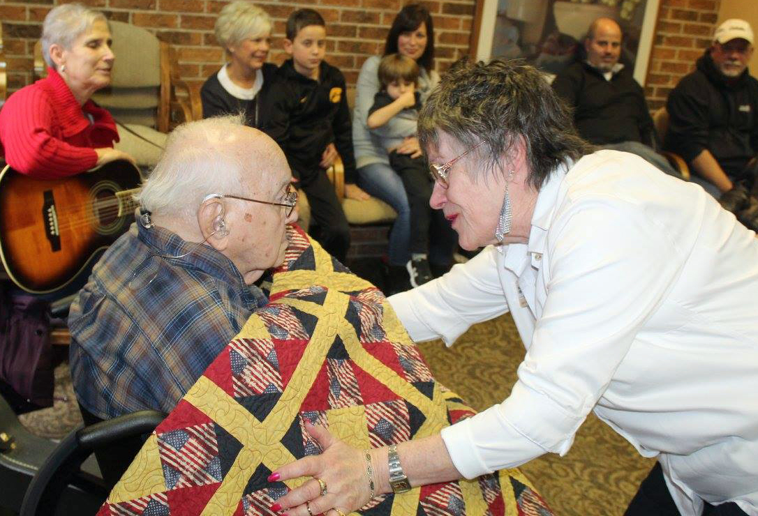 Elayne Gassett presents Bruce Talbox his Quilt of Valor.