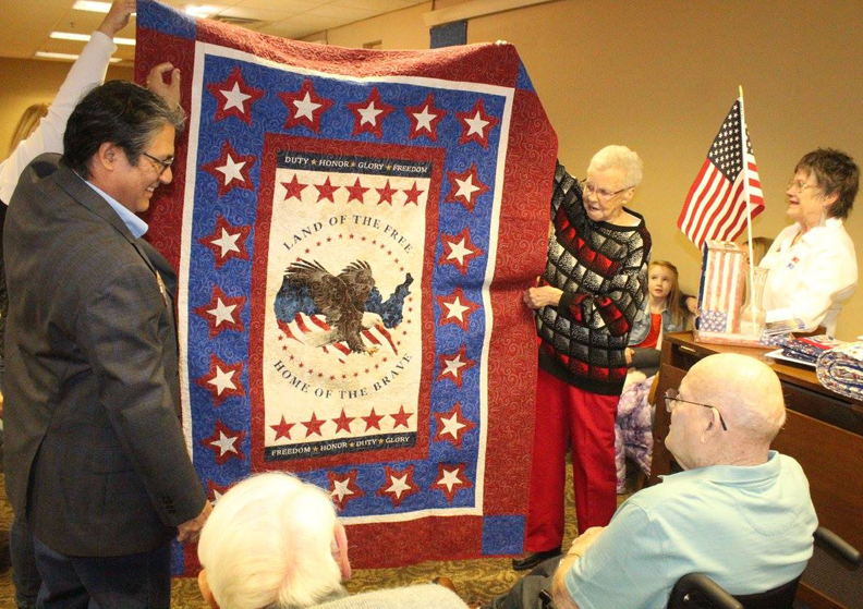 Jerry Green and Rita Moore show David Schirm his Quilt of Valor.