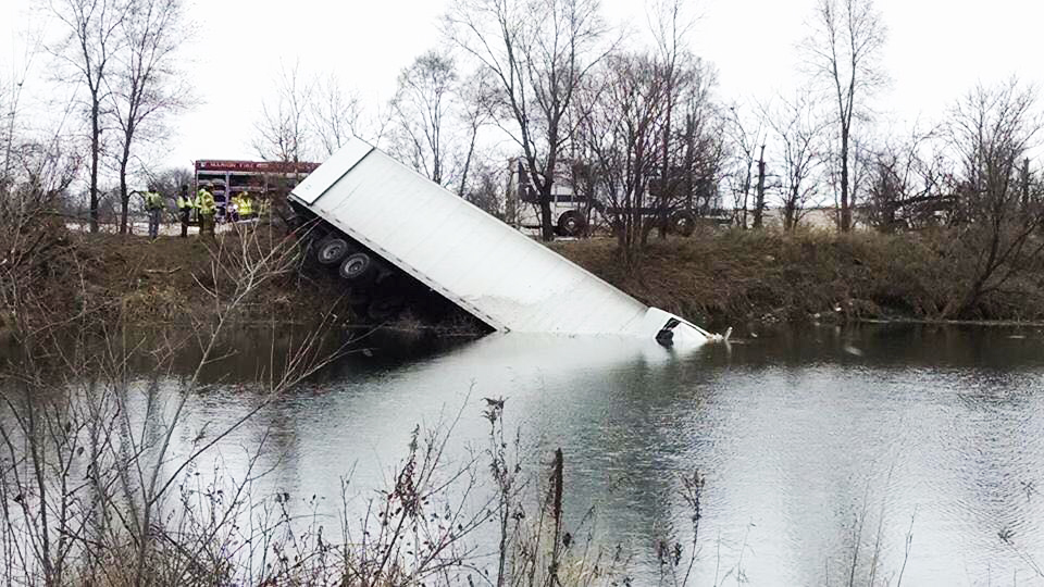Firefighters Jeff Hoover, Peter Lammer, Jeremy Smith and Zachary Bruce arrived on scene and were directed to a pond on the south side of the highway. A semi cab was nearly submerged (with the driver's side completely under water.) Witnesses on scene said they hadn't observed anyone exit the semi.