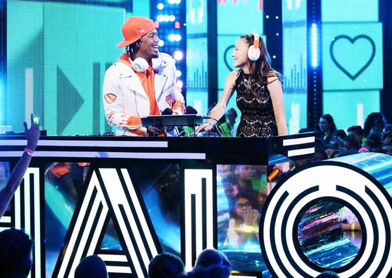 Raegan Junge speaks with host Nick Cannon during taping of the HALO Awards, which will air Sunday.
