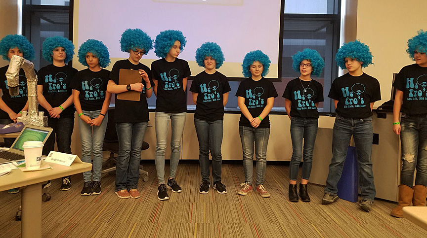 "Big Hair; Big Ides:' The H2O Fros present their research on a device to test water for lead.