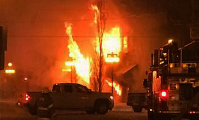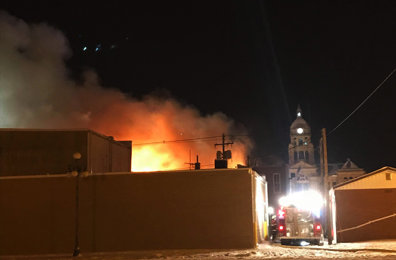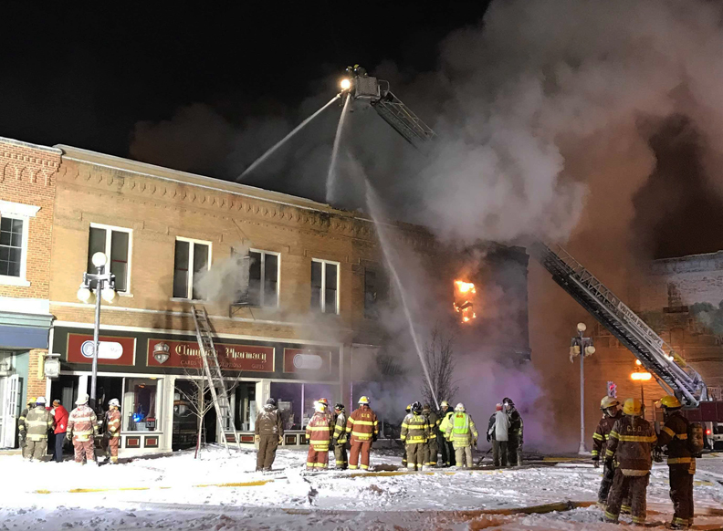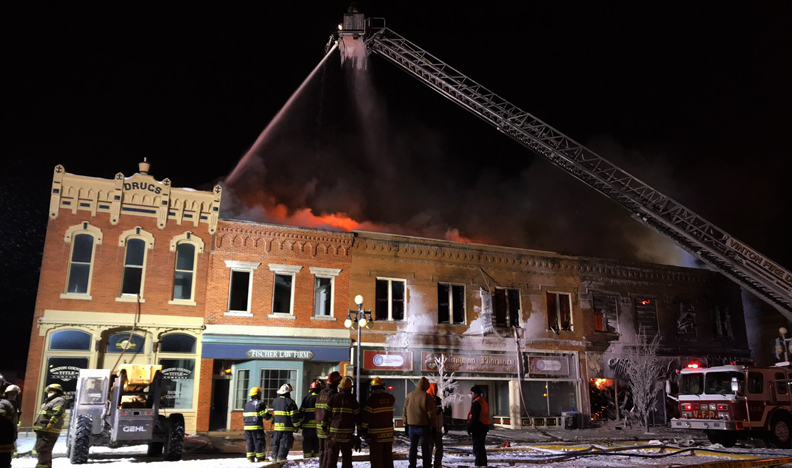 Vinton firefighters, using their aerial truck, are spraying the building from above in an effort to keep flames from spreading to other buildings. Firefighters from Urbana-Polk Township and Garrison also spent hours at the scene.