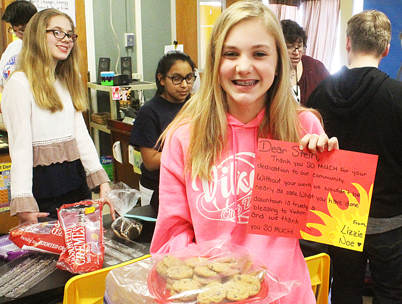 About 25 Vinton-Shellsburg Middle School students spent their RTI time on Wednesday, writing notes and packaging cookies to share with area firefighters as a thank you for the long hours they spent fighting the recent downtown fire.