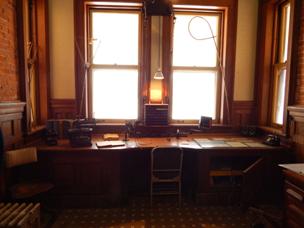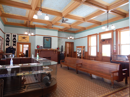 If you've never seen the hobo markings or entered The Depot don't let the opportunity slip by without peeking in. The foundation is dressed with Iowa limestone and the bricks fired right here in Benton County. Stroll through the arched port cochere and out onto the covered porch and envision the trains rolling in, passengers milling about, waiting to greet loved ones and waving farewell to others. Step through the doors onto the marble terrazzo tile floor and experience a glimpse of what travel was like a century ago. Notice the tin ceiling crafted right here in Vinton, the thick oak wainscoting that hugs the walls, and the classic "egg and dart" molding setting the tone of the last century throughout the building. There's also the dispatcher's room, a telegraph desk (above which still hangs the original porcelain lamp), and plenty of passenger train mementos including timetables, railroad rules and regulations, as well as menus, uniforms, and fare tables.