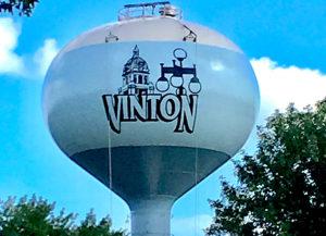 Two familiar Vinton icons, the Benton County Courthouse bell tower, and the lights of downtown Vinton, now adorn the Kiwanis Park water tower.
