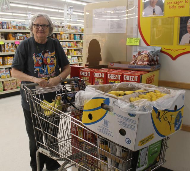 While this was happening, behind the picture, or she tried to hide behind the picture, Barb Rego told me that her cart contained food bought to help with the food give away program that she started a few years ago, showing me a case of bananas and a couple cases of corn that Fareway was helping her with.