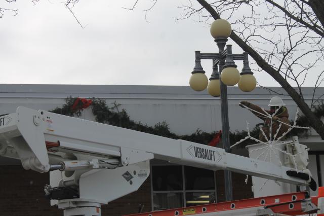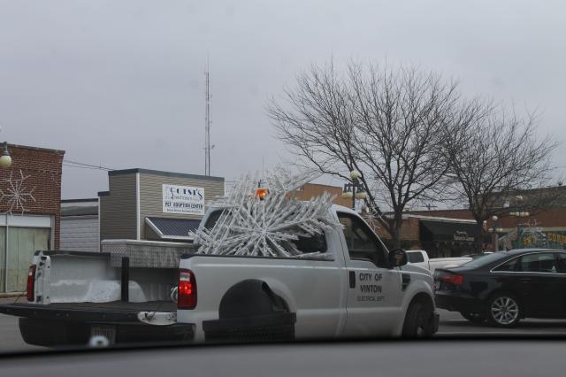 This is why! We were waiting on the Vinton Municipal Electric Utilities to bring the snowflakes! Seriously, these are the guys are the ones that make the city look great for Christmas. They were out today putting up the decorations to make our little town look nice for the Christmas season. Thanks guys! (I don't know about you, but if these are the only snowflakes we see, I'm good!)