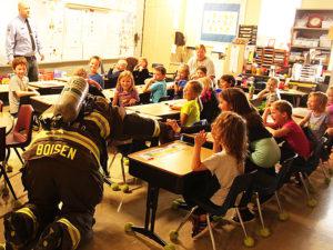 They visit the classroom and explain to the children, while the fireman is in their gear what the fireman will look like when he's looking for you. Something I think will probably save a child's life at some point, They explain that they shouldn't be afraid of the sight or the sound of the air tank that is on the fireman. They also showed the children how they crawl along the side of the wall to feel their way through the room so that they don't miss anything.