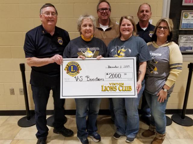 The Lions Club recently presented the V/S Booster Club with a check for $2000 dollars, money generated from the Lions food trailer sales at this fall's football games. For the past eight years the Lions Club has presented the Booster Club with a check which the Boosters use to provide equipment, supplies, uniforms etc. for the V/S athletic program. The Boosters, through their hard work and dedication have provided needed items for the athletes in our schools for many years. The Lions want to thank those who patronize our trailer so we are able to help the Booster Club support our student-athletes.