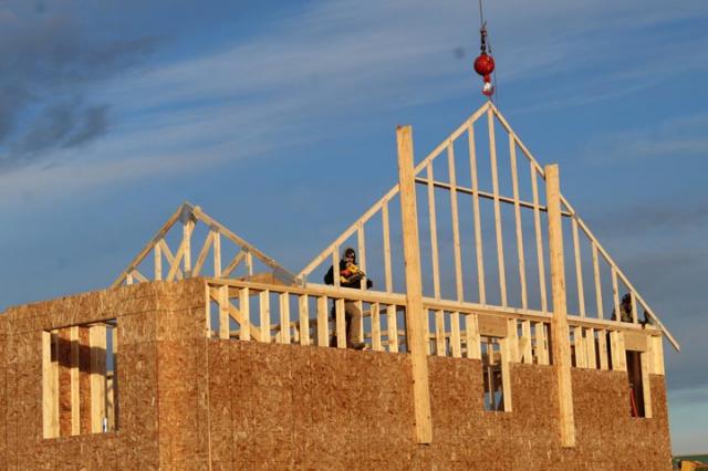 Monday the rafters were lifted onto the house with the help of a crane and the roof began to take shape. With the walls framed, the walls were put up as well.