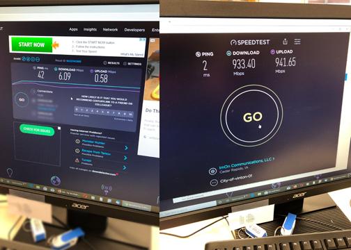 A speed test was the first order of business when Matt Baker, the FARR Technologies staff member who has been working in Vinton since early in the project, connected the iVinton office to the new fiber network on Wednesday, February 12th. The connection with the company iVinton was using tested at 6.09 megabits for download speed and .58 for upload. The iVinton connection tested at 933.4 for the download speed and 941.65 for upload.
