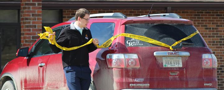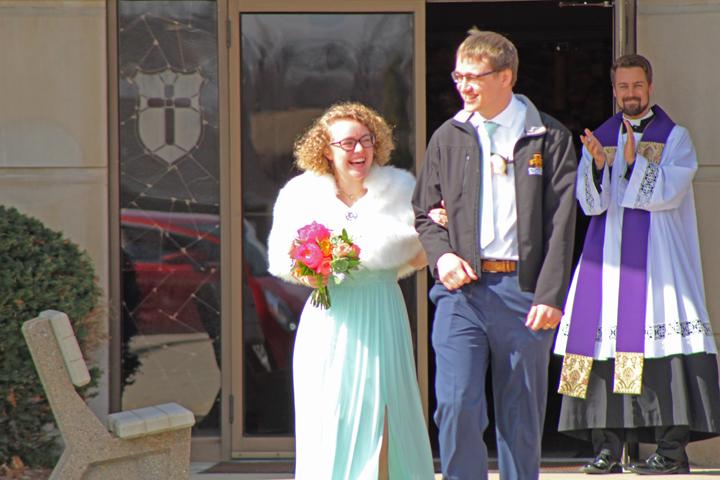 As the couple walked to their car, they made a quick decision to stay and wave at everyone as part of their reception line, which should have taken place inside rather than in the chilly 34-degree parking lot. The couple bravely stood outside and waited for the last car to pull out.