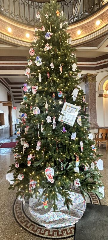 The tree, now a centerpiece of the courthouse's holiday decor, features ornaments ranging from cheerful snowmen to bright candy canes, each one a vibrant expression of the children’s creativity. Visitors to the courthouse have already begun stopping to admire the display, many remarking on how the ornaments bring a touch of warmth and whimsy to the building.