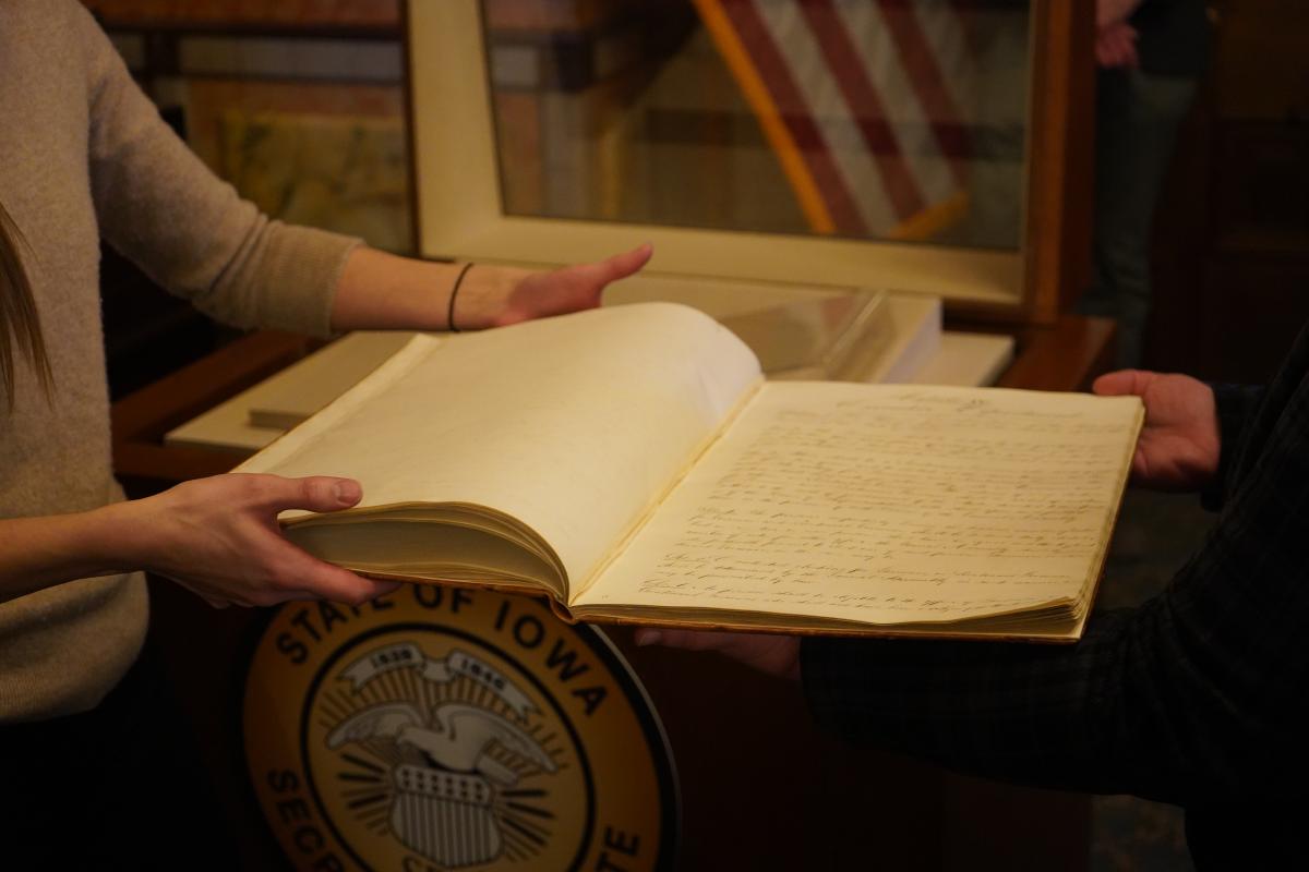“We take great pride in being able to display this historic document in our office for Iowans,” said Secretary Pate. “When Iowans can see their state’s original constitution with their own eyes, it creates a powerful connection between Iowa citizens and the document that established their fundamental rights and freedoms. It can transform the abstract idea of history into something deeply meaningful.”
