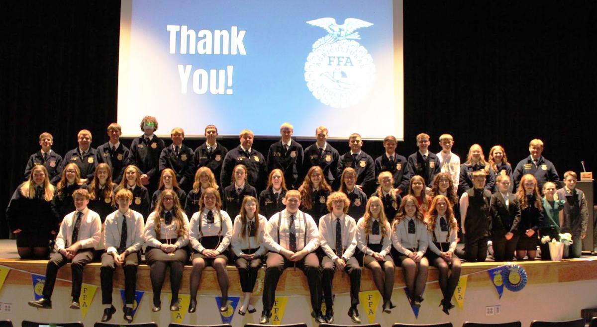 Following dinner, the ceremony began with the opening ceremonies of the retiring officers, followed with the FFA Creed given by Katelyn Fleming. 102 supporters were recognized with Appreciation Awards for their efforts such as helping with the chapter's crop plot, contest judging, chapter officer elections, general assistance throughout the year, and the volunteer auction. Leadership-Merit Awards were then handed out to 51 members who met the point requirements based on participation. Next, 21 members were honored as committee chairs for leading efforts in the chapter's Program of Activities.