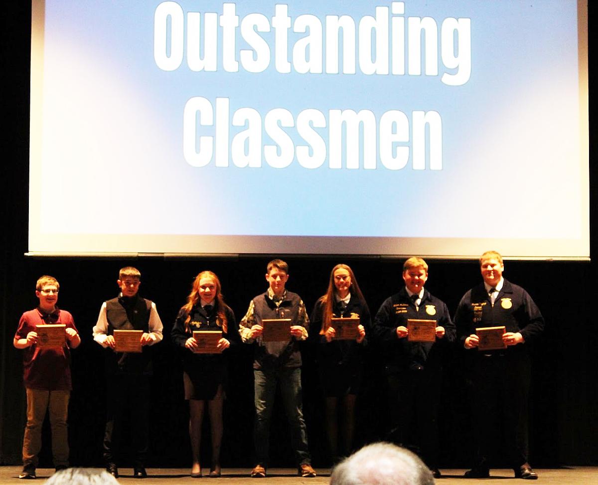 The banquet continued with the announcement of Star Awards. Abby McKenna was named Star Greenhand, Austin Noe was Star Chapter Farmer, Andrew Pingenot received the Star in Agribusiness, and Megan Schlitter was named the Star in Ag Placement. After that Outstanding Classmen were recognized by grade; 6th: Jessen Demuth, 7th: Wes Lacey, 8th: Wyatt Shaver, 9th: Zoey McClintock, 10th: Sophia Newton, 11th: Will McKenna, 12th: Andrew Pingenot. Ben Buhr was named the SAE Award recipient and Alana Fleming was awarded the Senior Service award.