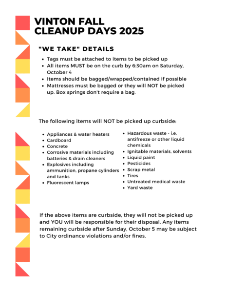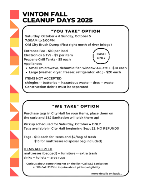 This year the City of Vinton is partnering with S&J Sanitation to offer two options to help Vinton residents take advantage of this weekend. Friendly reminder, this weekend is intended for residential homes/apartments only, not businesses.