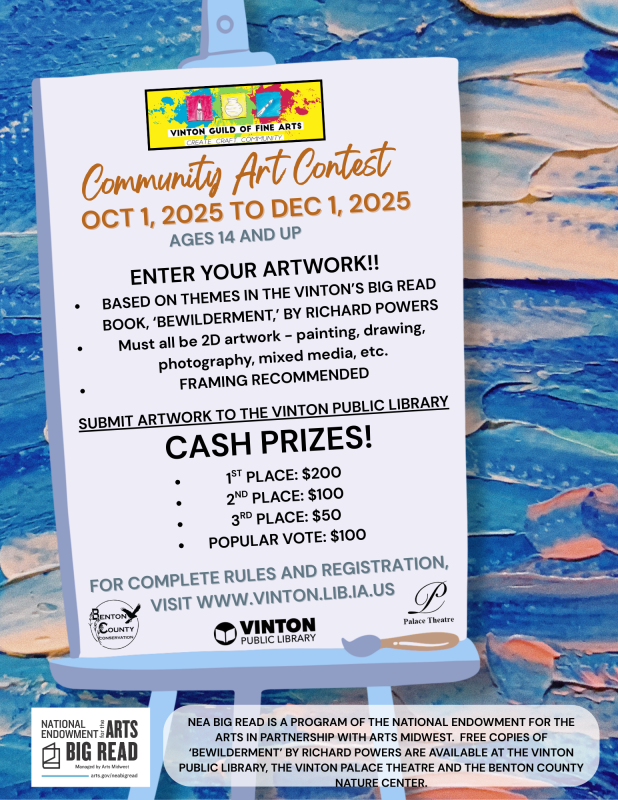 One of the many free activities that will take place this year, as part of Vinton’s “Big Read” initiative, will be a Community Art Contest to take place October 1 – December 1, 2025. Vinton’s “Big Read” is a community collaboration focused on the book “Bewilderment” by Richard Powers, under which a variety of arts, conservation, astronomy, and literary events and programs are being offered related to the themes of the book. Vinton’s Big Read is sponsored by the Vinton Public Library, Benton County Conservation, the Vinton Guild of Fine Arts (VGFA), and the Vinton Palace Theatre, with funding from the National Endowment for the Arts, Arts Midwest, the Charles and Helen Yundt Charitable Foundation, and Friends of the Vinton Public Library. Stop in and pick up your FREE book at the Library or other locations in Vinton.