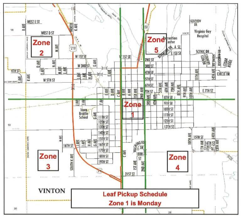 - The Street Department has begun curbside leaf pickup for the season. Pickup will continue as long as leaves are plentiful and weather permits. Please place leaves 12 inches from the curb. No vines, sticks or other plant matter. Leaves only! Check the map for the pickup day in your neighborhood. https://www.cityofvinton.org/street/leaf-cleanup-schedule