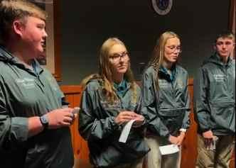 Vinton-Shellsburg's FFA group has been very active in the community and in their organization. Representatives of the group spoke to the Vinton Kiwanis Club at their noon meeting in November. Present to share were Will McKenna, FFA President, Sophia Newton, FFA Secretary, Cole Birker, Officer-at-large and Bri Dulin, Co-Reporter. The group was accompanied by Loiuse Flemming, a co-advisor.