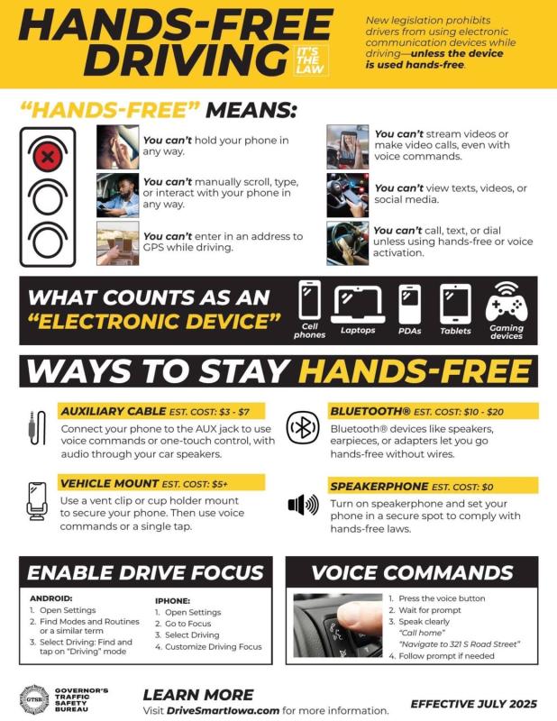 Starting TODAY: Iowa moves from warning to enforcement - hands‑free only while driving. Law Enforcement may now issue citations for any use of electronic devices while driving unless the device is used hands‑free.
