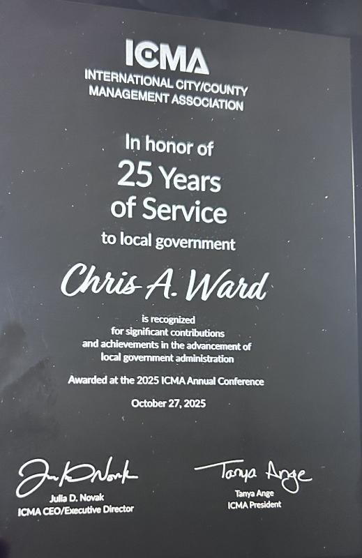 The City of Vinton congratulated City Administrator Chris Ward for completing his 25th year of service. Ward was recognized by the ICMA (International City/County Management Association) for serving local governments in Tampa, Florida, as part of a ceremony recognizing others who have served from across the country.