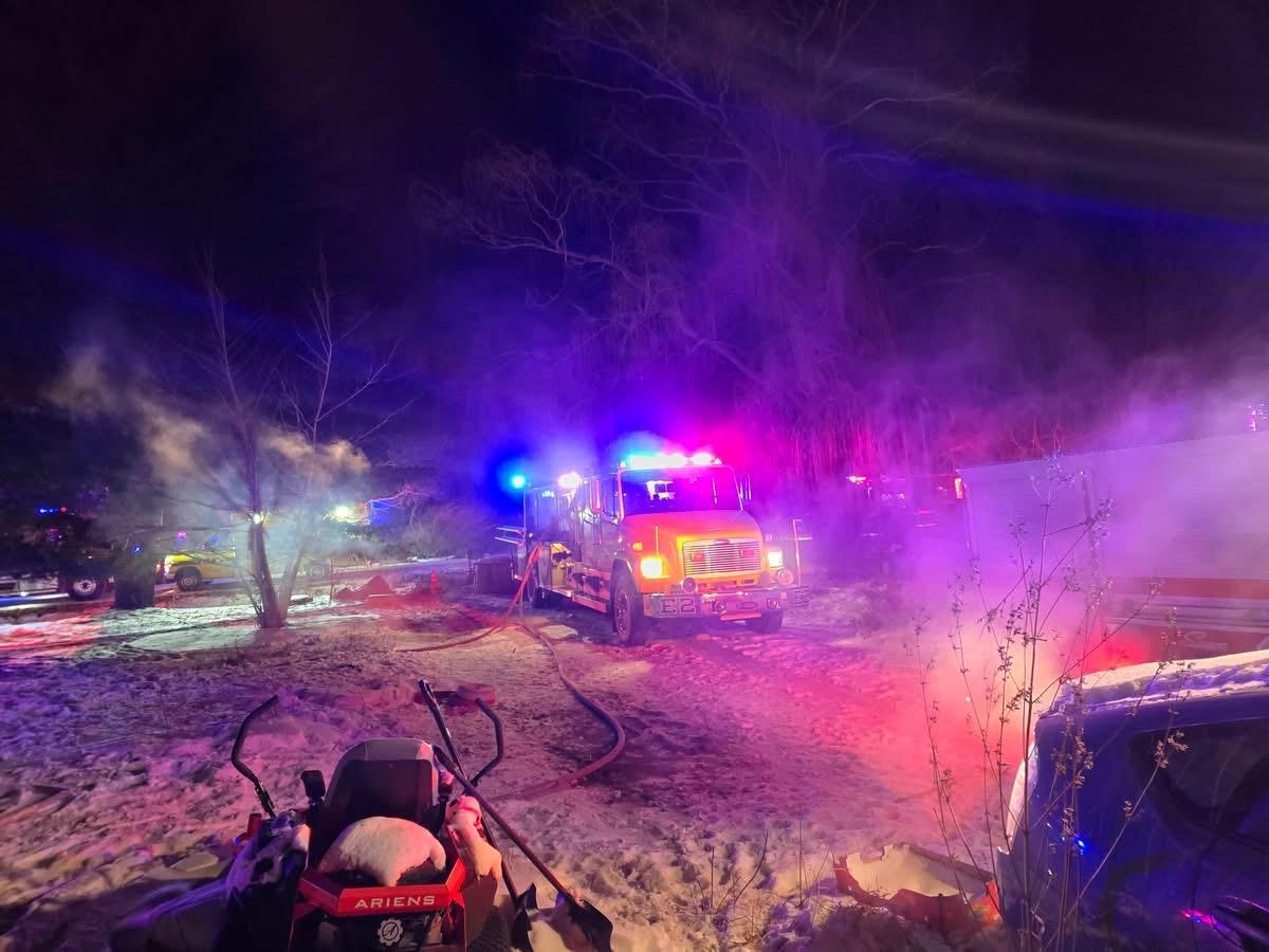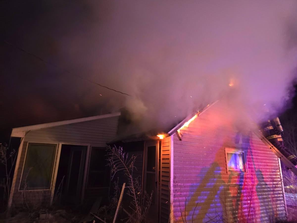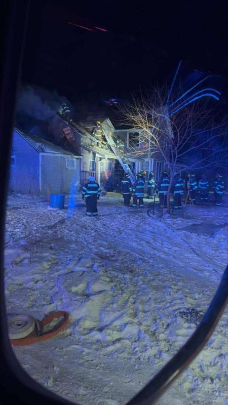At around 12:00 am the fire was under control and mutual aid was released from the scene. Our portable water tank was also difficult to drain due to the extreme freezing temperatures. After all tools and hose lines were cleaned up, a hot spot between the roof and ceiling flared up requiring more overhaul operations to gain access to the fire and was extinguished using a fire extinguisher. At around 1:15 am Brandon Fire gave the all clear to leave the scene 4.5hrs after the incident was reported.