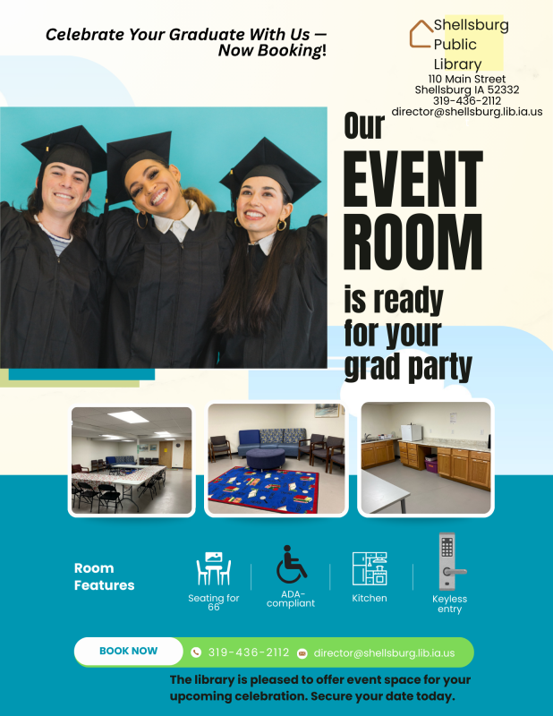 Celebrate your graduate with us. Shellsburg Public Library has an event room waiting for your grad party and much more. We have seating for 66, ADA compliant, kitchen and a keyless entry. Please contact the Shellsburg Public Library at 319-436-2112 or email us at director@shellsburg.lib.ia.us.