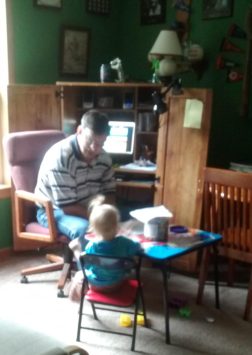 The grandpa sees an opportunity to put the little girl down for a nap so that he can work.