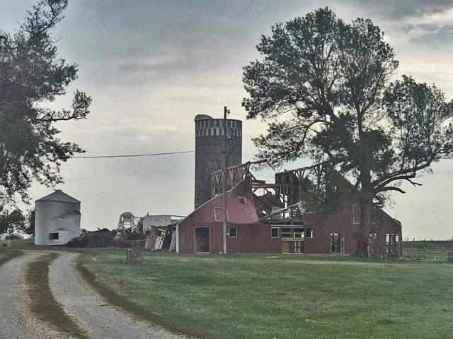 I drove through an area cemetery just to check on the great grandparents, they seemed to have faired fine, but I swear they moved and changed their headstone, apparently I need to visit more often. Then I headed down to Norway. I saw more damage north of VanHorne. Even though it's the same story at every farm just about, grain bins down, barns gone, trees shredded and uprooted, houses damaged, and crops just flattened, each place deserves to be documented, even though I know I can't cover them all.