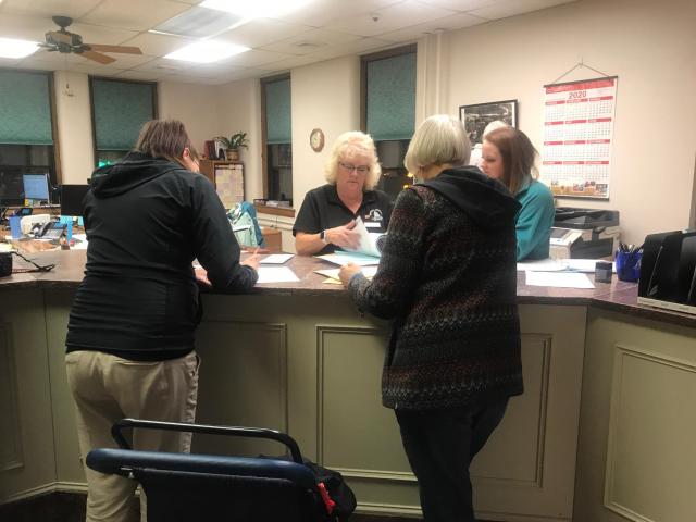 The courthouse was already lit up on the second floor, home of the Auditor's Office. Hayley Rippel and Gina Edler these two gals, let me brag on them a bit. Even though Hayley is elected for this job, she takes the seriousness of protecting our election as you'd want her to. She's quick to point out that the slightest suggestion of improper behavior cannot be tolerated. Gina is the Energizer Bunny before and on Election Day. This gal is the one you want to plan a trip for you. She spent a couple of hours training us on how to run the polls, after spending days packing our bags to get us through the election with supplies that you might not think that you'll need, but you do. This year we had a special COVID rubbermaid complete with gloves, masks, face shields, hand sanitizer and spritz bottles so that we could continually sanitize our area throughout the day. Something that is not normal for elections.