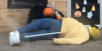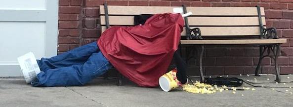 Saturday these Scarecrows were standing proudly outside the businesses, especially on A Ave. but I have my suspicions that after the businesses closed down for the weekend, the Scarecrows came to life and had a little too much fun. As I sat and talked to the Skeletons in front of the Palace, their buddy came stumbling home and wiped out spilling his popcorn all over the place.