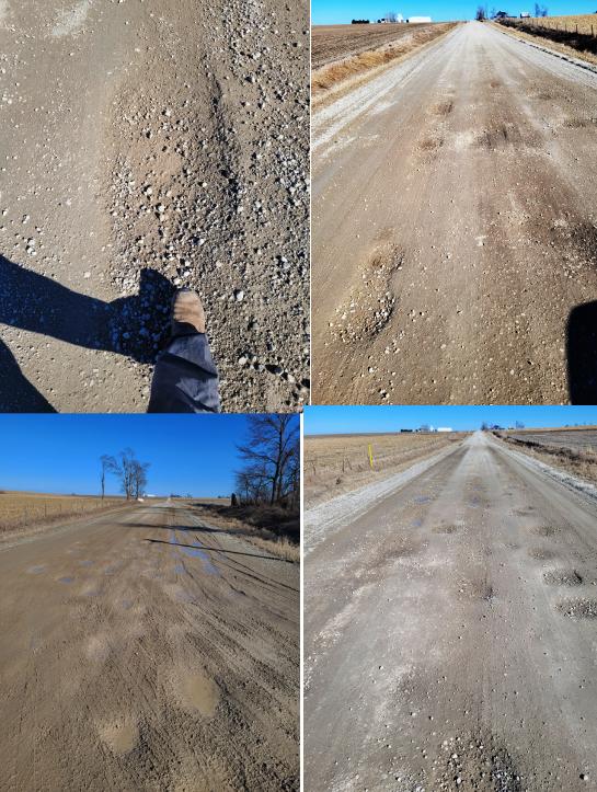 The topic of roads is on the minds of some this week. I had a note from Zale Owens who sent in pictures of the roads in his part of the county. "I'm writing in to show the rural road conditions in Vinton. I've contacted Benton County, and accounts of the road conditions out here vastly differ from those working inside the Courthouse. I'd like everyone to be aware that the roads require rock. The potholes are big and many, and some stretches of just this one road have more holes than Swiss cheese," he said. The photos attached are from 65th Street just west of highway 218.