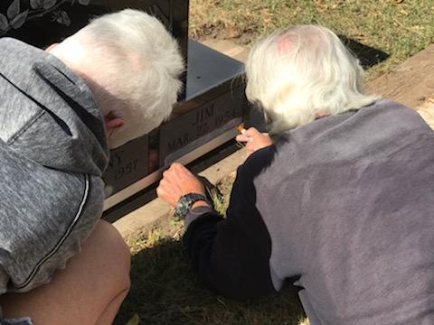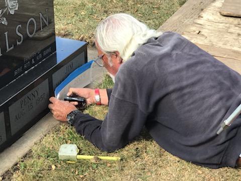 It was Mark and Carolyn Phippen. Carolyn was cleaning the area around a headstone, pulling weeds, cutting away the overgrowth from the cement at the base of the stone. She was making sure that the area looked clean and tidy. Mark was setting up his equipment in preparation to add a date to the headstone.