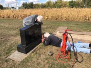 Getting down to the level of the empty space on the stone, which mean laying on the ground. Mark set to work. Preparing the stone to hold the stencil for the engraving, I watched as he carefully lined up the dates. Making sure that it was centered and then he had to make sure that it was straight which can be more work than the rest of the job.