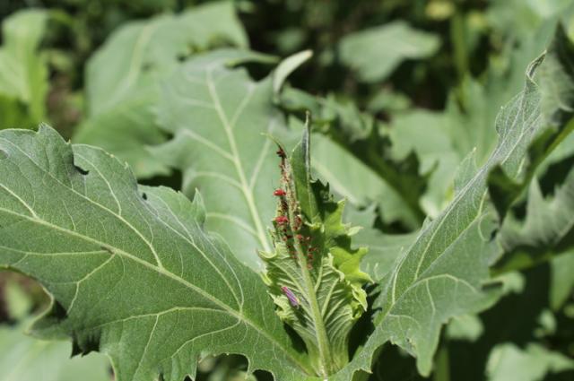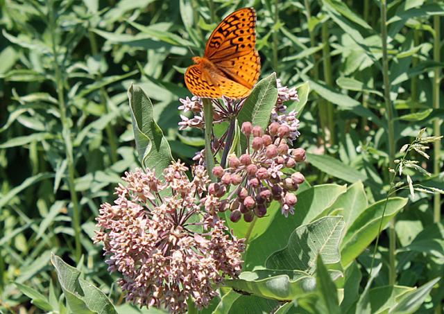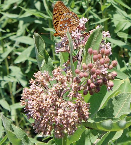 The butterfly ball is actually a common milkweed; the butterfly on it in the photo is a Great Spangled Fritillary. The weed with the pink stuff is called a cup plant, which can be invasive. Mark said the weed has some insect visitors, including aphids and a pink potato leaf hopper. I had to ask him to explain where to find it, but now I do see that the pink spot on a leaf is indeed an insect.