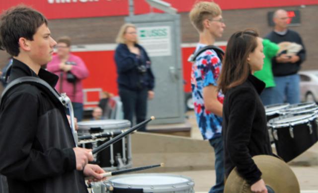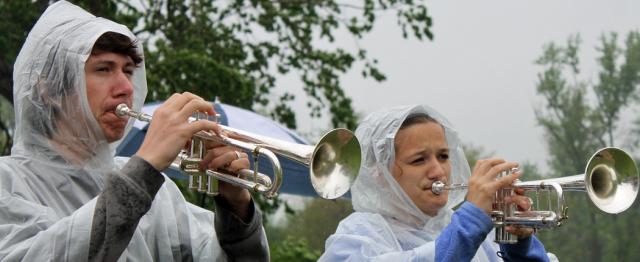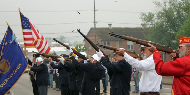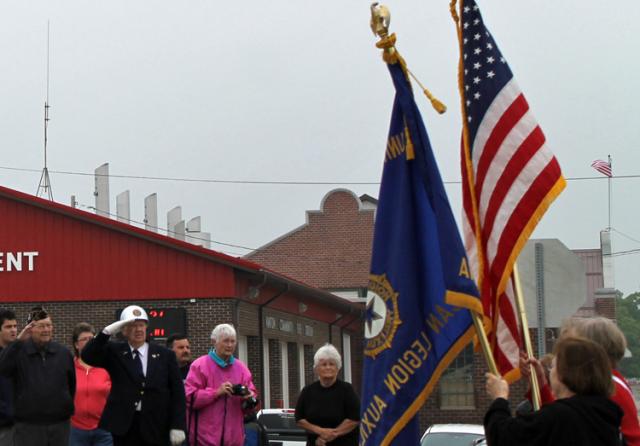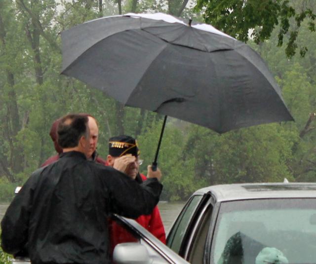 The veteran slowly made his way to the car, in the rain. But instead of getting in the car and out of the rain, Larry insisted on standing to salute his fallen comrades. He stood, as friend held the umbrella, saluting as fellow veterans fired their weapons three times, and then as two high school band members played taps.
