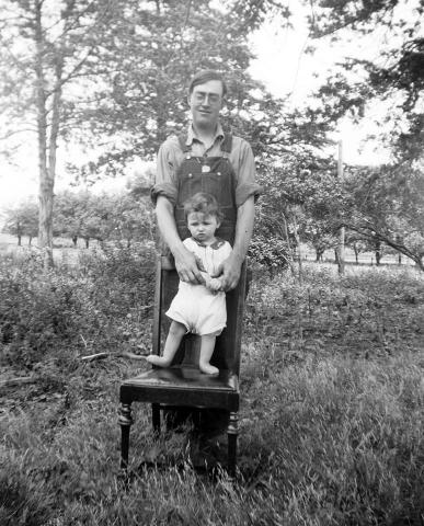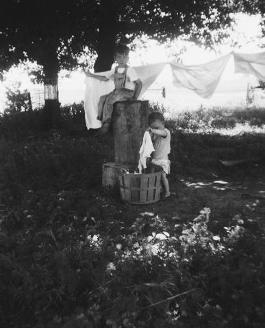 I have a picture of my dad and uncle on diaper duty. My dad is sitting on a tree stump to reach the clothes line, and my uncle, the younger of the two is handing him a diaper to hang.